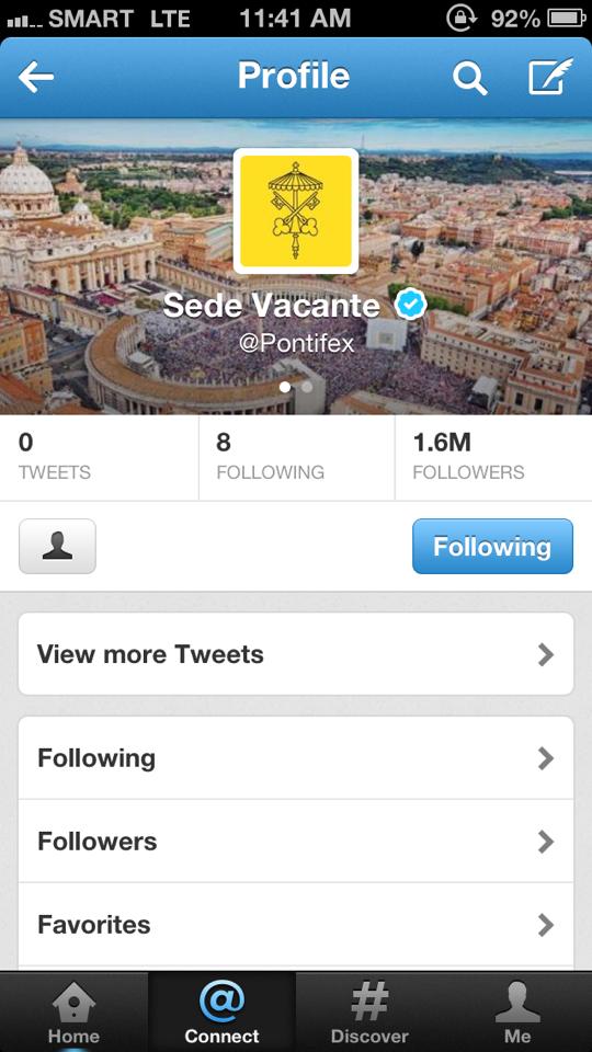 The traditions of the papacy is engulfed in rich history. From the breaking of the papal seal to hitting the head of a deceased pope with a hammer, a new Church tradition has begun in the digital age. The sede vacante (from Latin sedes, -is; chair; third declension) which is the term given to the time period between popes seems to also appy in the digital age. With over 1.6M followers on Twitter, @Pontifex has deleted all its previous tweets to symbolize that the papacy is in transition. The screen name of Pope Benedict VI has also been removed to honor the sede vacante.