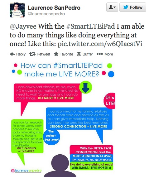 Why he won: After going through hundreds of entries, I was able to visualize Laurence San Pedro’s entry because of the cool image he attached as a Twitter card. Although this wasn’t a requirement in the contest, the extra effort paid off. It was the most unique way to present the answer to the contest question.