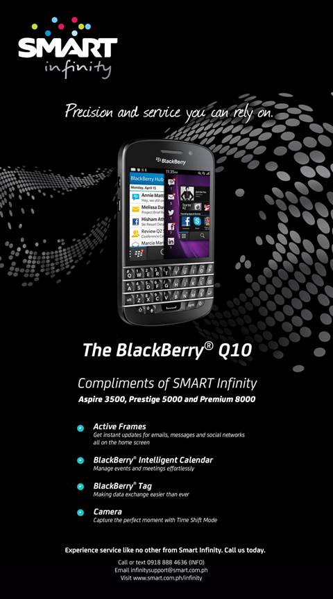 If you still need a slight nudge to fully convince you to jump into the Q10 experience, SMART Infinity has the Q10 for you at the following plans: Aspire 3500, Prestige 5000 and Premium 8000.
