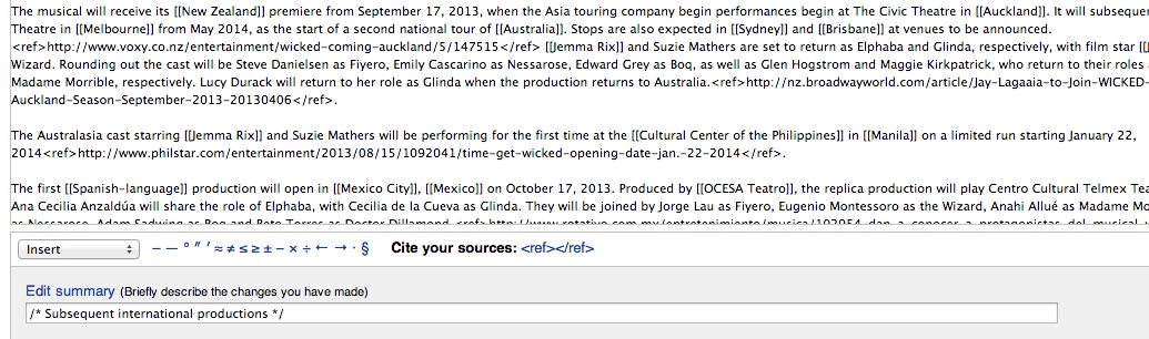 How could you possible include a geeky tech angle to WICKED finally showing in Manila this 2014? Well, when everyone else was tweeting and Instagram-ing, the first thing I did was to edit the WICKED (Musical) Wikipedia entry to add Manila, Philippines and the CCP to the list of international shows: