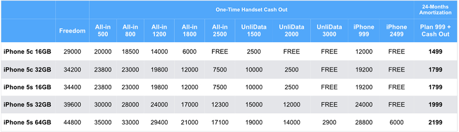 – the iPhone 5c (16GB) on All-In Plan 1800 because even if you can get it free on Plan 2500, if you do the computations, shelling out an extra PHP 6,000 is better than the extra PHP 700 a month, which amounts to PHP 16,800 for the 24 month period lock in. This is because at Plan 1800 you’re well within range of these three promos: PHP 1,000 unlimited surfing, PHP 350 for 3,500 messages to all networks (yes including Globe!) and PHP 250 for 80 minutes of calling to all networks. So 1,000 + 350 + 250 = 1600 which leaves you with PHP 200 to consume for other things.