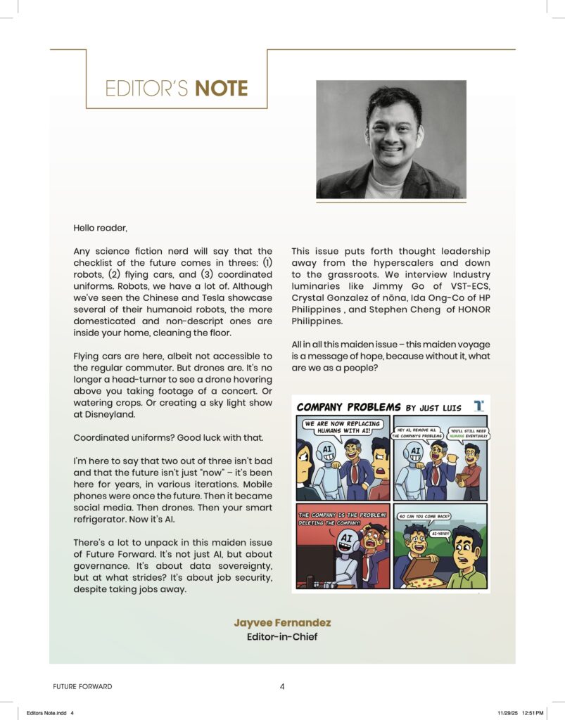 This issue puts forth thought leadership away from the hyperscalers and down to the grassroots. We interview industry luminaries like Prep Palacios of Google, Stephen Cheng of HONOR, and Ida Ong-Co of HP Philippines on the horizon we look forward to as a human species.