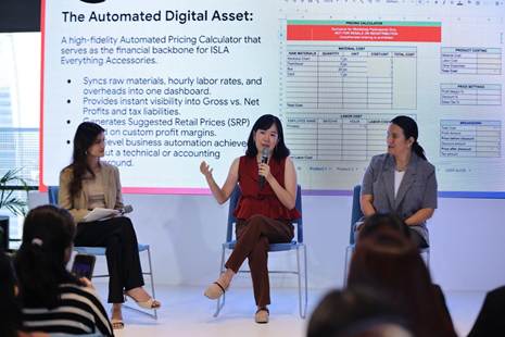 Princess Alvarez (center) breaks down the features of her automated pricing calculator. She explained that this Gemini-powered spreadsheet serves as the financial backbone for ISLA Everything Accessories and provides her with real-time visibility into her profits.