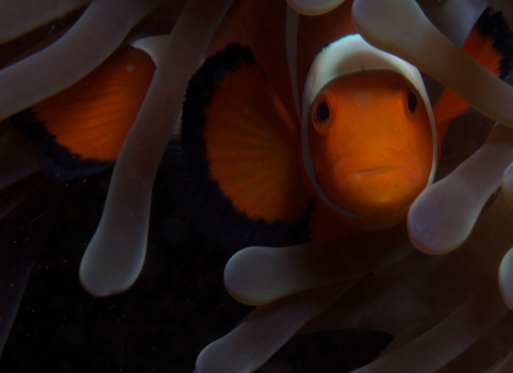 And also, other types of fish like this curious lionfish, a shy clownfish hiding in its anemone home and a camouflaged baby frogfish resting on a coral.